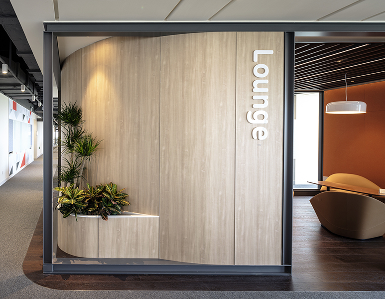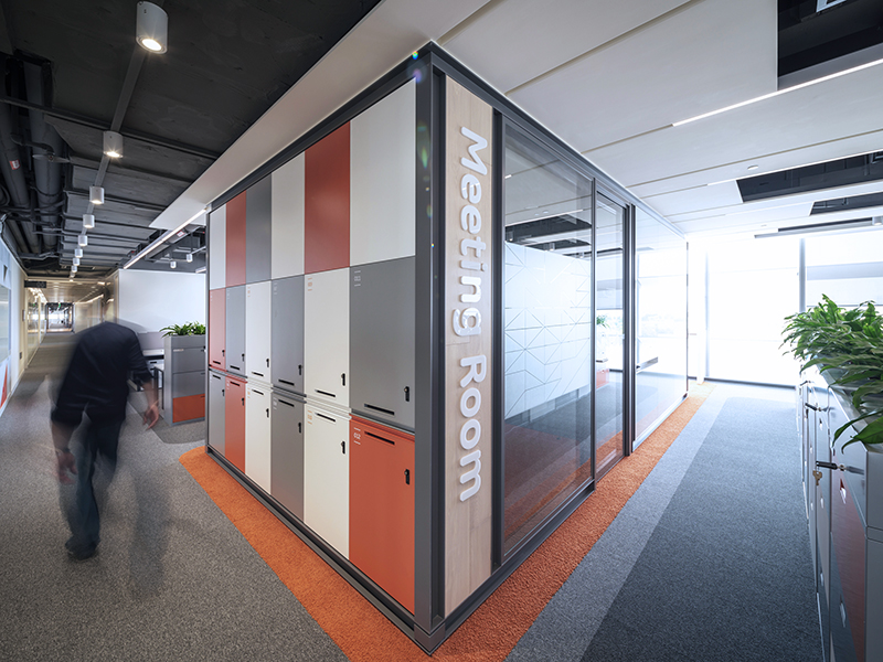 为了提升GE的工业感理念,以及未来的空间可变性,我们采用了工字钢结构来搭建办公空间内的主要封闭空间;工字钢以螺栓形式连接,提供了未来可拆卸,并且能够重新组装移位的可变性;特殊的工字钢框体设计也提升了GE办公室的设计辨识度。工字钢盒子的内部为会议室,电话间,以及Executive Lounge等功能;而外部则为各种不同的公共功能墙面,例如茶水点,可写白板,钉板墙等不同形态的协作区域,让员工能够围绕盒子进行不同形态的交流及对话,激发员工之间的沟通及创意思维。盒子的摆放位置也考虑到了不同部门的划分,以及围合功能。