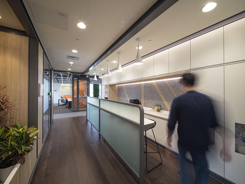 我们在8楼办公空间的正中央设计了一个独特的Community Center;较为居中的布局位置不但提供了使用上的便利性,并且拥有较好的景观及光照面。简约休闲的空间设计,日常作为员工休息交流的咖啡厅功能,而家具收起时也可作为聚集性的活动空间使用。